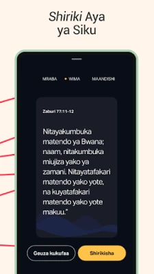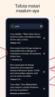 Biblia Nje ya Mtandao ya YouVersion inakupa uwezo wa kushiriki baraka za Neno la Mungu na wapendwa wako. Unda picha za kuvutia zenye aya za Biblia na uzishiriki kwa urahisi kupitia majukwaa mbalimbali kama vile WhatsApp, ujumbe mfupi, Facebook, Instagram, na Twitter, ukiwatia moyo marafiki na familia yako. Programu hii ni zaidi ya Biblia tu; ni chombo kamili cha kiroho kinachokaa kiganjani mwako, kikikupa ufikiaji wa Neno la Mungu lililotafsiriwa kwa Kiswahili na Kiingereza, na pia fursa ya kusikiliza Maandiko Matakatifu, ikifanya safari yako ya imani kuwa rahisi na yenye kutia moyo zaidi.